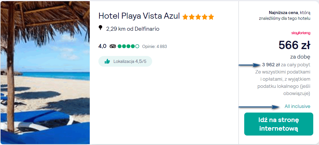 Na miejscu zatrzymasz się w bardzo dobrym 5* hotelu Playa Vista Azul, który położny jest bezpośrednio przy plaży (leżaki i parasole oraz ręczniki – gratis).