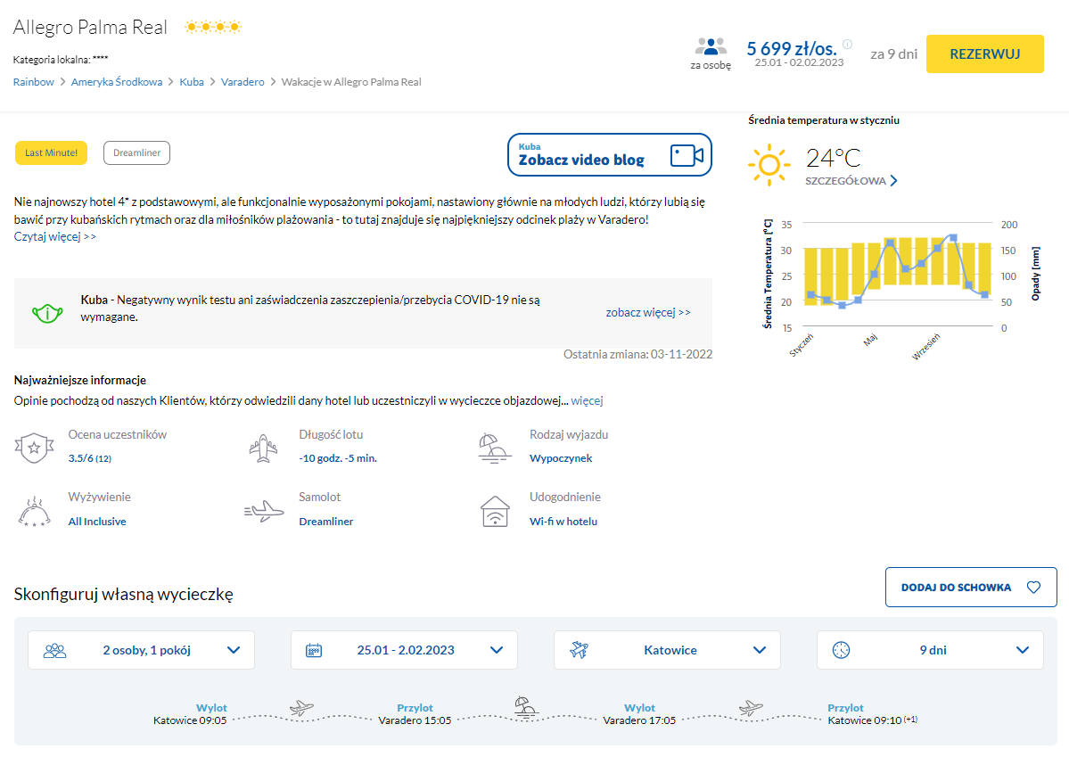 Na Kubę polecisz w terminie 25 stycznia – 2 lutego. Czeka cię bezpośrednia podróż z Katowic, realizowana na pokładzie Dreamlinera w barwach PLL LOT. W cenę pakietu wliczono podróż z bagażem rejestrowanym (nadawanym do luku).