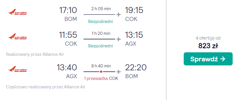 Drugim elementem układanki będą przeloty pomiędzy Bombajem a wyspą Agatti z 3-dniową przerwą w miejscowości Koczin. Całą podróż z kontynentalnych Indii na archipelag i z powrotem odbędziecie na pokładach samolotów linii Air India. Bez dodatkowych kosztów zabrać ze sobą będziecie mogli bagaż podręczny oraz przedmiot osobisty (mały plecak lub damską torebkę).