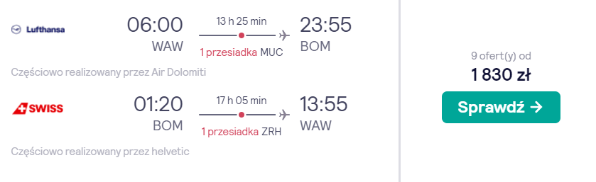 Aby dotrzeć na rajski archipelag wysp leżących na Morzu Lakkadiwskim, będziecie musieli dokonać dwóch rezerwacji biletów lotniczych. Pierwszym etapem podróży będzie przelot ze stolicy Polski do Bombaju w terminie 5-20 lutego. Trasę tam i z powrotem pokonacie na pokładach samolotów linii wchodzących w skład sojuszu Star Alliance (m.in. Lufthansa oraz Swiss International Air Lines). Po drodze czekać was będą wygodne przesiadki na lotniskach w Monachium oraz Zurychu. Obie zagwarantowane są przez przewoźników, a w razie jakichkolwiek opóźnień wynikających z winy linii lotniczej otrzymacie bezpłatnie nowy bilet na dalszą drogę.