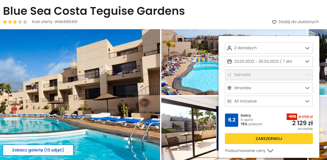 Na Wyspach Kanaryjskich będziecie zakwaterowani w bardzo dobrze ocenianym 3* hotelu Blue Sea Costa Teguise Gardens. To klimatyczny aparthotel położony tuż nad morzem. Na miejscu do waszej dyspozycji będą komfortowo urządzone pokoje, odkryty basen oraz wyżywienie w formule zróżnicowanego all inclusive.