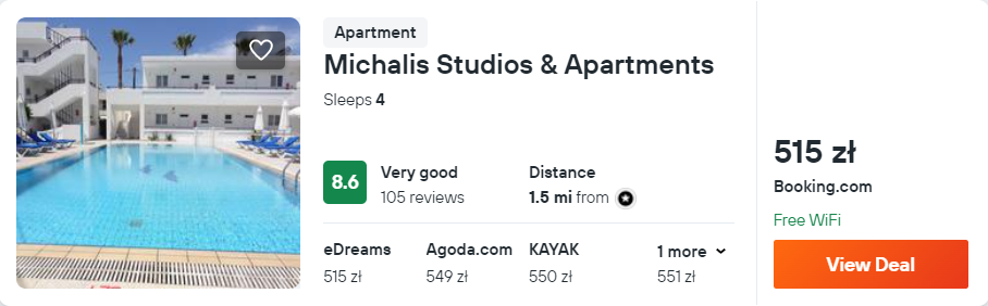 Na wyspie Kos zatrzymasz się w znakomitym obiekcie Michalis Studios & Apartments, który od plaży Paradiso oddalony jest o 700 metrów. Z lotniska w okolice miejsca noclegowego dojedziesz komunikacją publiczną lub wypożyczonym samochodem – szczegóły poniżej.