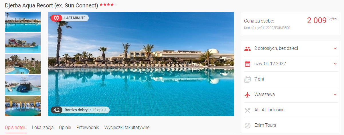 Do Afryki udasz się już za kilka dni, w terminie 1 – 8 grudnia. Na Dżerbę polecisz bezpośrednio z Katowic lub Warszawy, a w cenę pakietu wliczono bagaż rejestrowany (nadawany do luku).