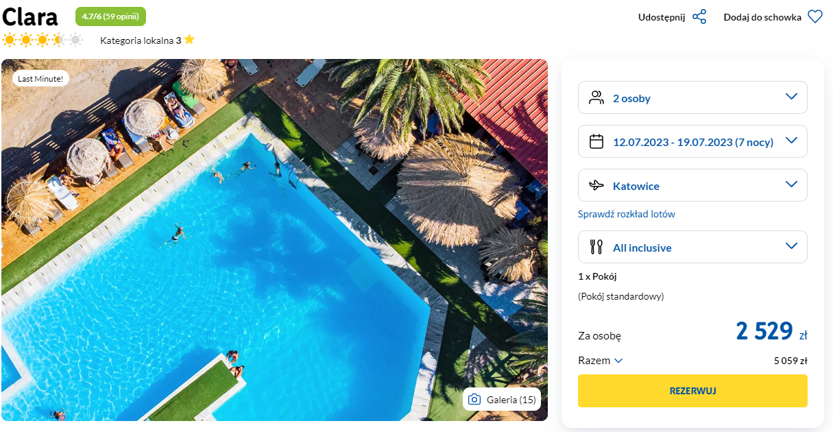 Wczasy spędzisz w 3* hotelu Clara. Plaża znajduje się w odległości około 100 m od kompleksu. Na terenie obiektu skorzystasz z odkrytego basenu i tarasu słonecznego oraz będziesz zakwaterowany w komfortowym pokoju z prywatną łazienką, klimatyzacją i balkonem.