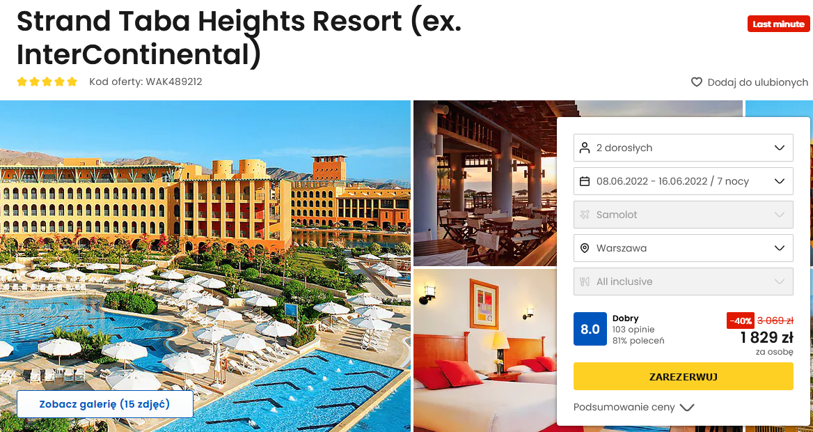 Na urlop polecicie w terminie 8-15 czerwca, a jako miejsce wyloty możecie wybrać Katowice lub Warszawę. W Egipcie spędzicie tydzień w 5* hotelu Strand Taba Heights Resort, który położony jest bezpośrednio przy prywatnej plaży. W hotelu do waszej dyspozycji będą restauracje, 4 bary i kompleks basenów. Skorzystacie również ze strefy spa & wellness.