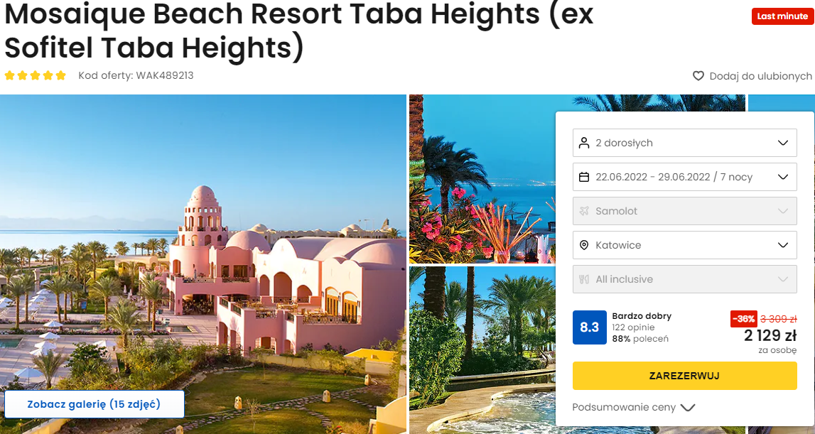 Na urlop polecicie w terminie 22-29 czerwca, a jako miejsce wyloty możecie wybrać Katowice lub Warszawę. W Egipcie spędzicie tydzień w 5* hotelu Mosaique Beach Resort Taba Heights, który położony jest bezpośrednio przy plaży w Zatoce Akaba, z widokiem na góry. W hotelu do waszej dyspozycji będą restauracje, bary i kompleks basenów.