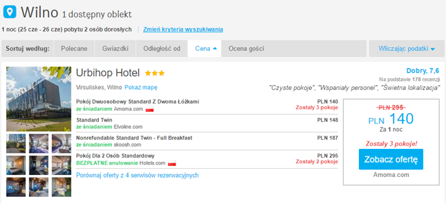 W Wilnie polecam zatrzymać się w 3* Urbihop Hotel za 140 PLN/2 os./noc.