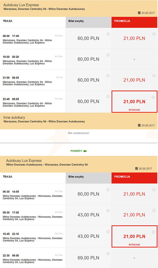 - Przejazd z Warszawy do Wilna (24 (25) – 26 czerwca) za 84 PLN/2 os. (42 PLN/os.)