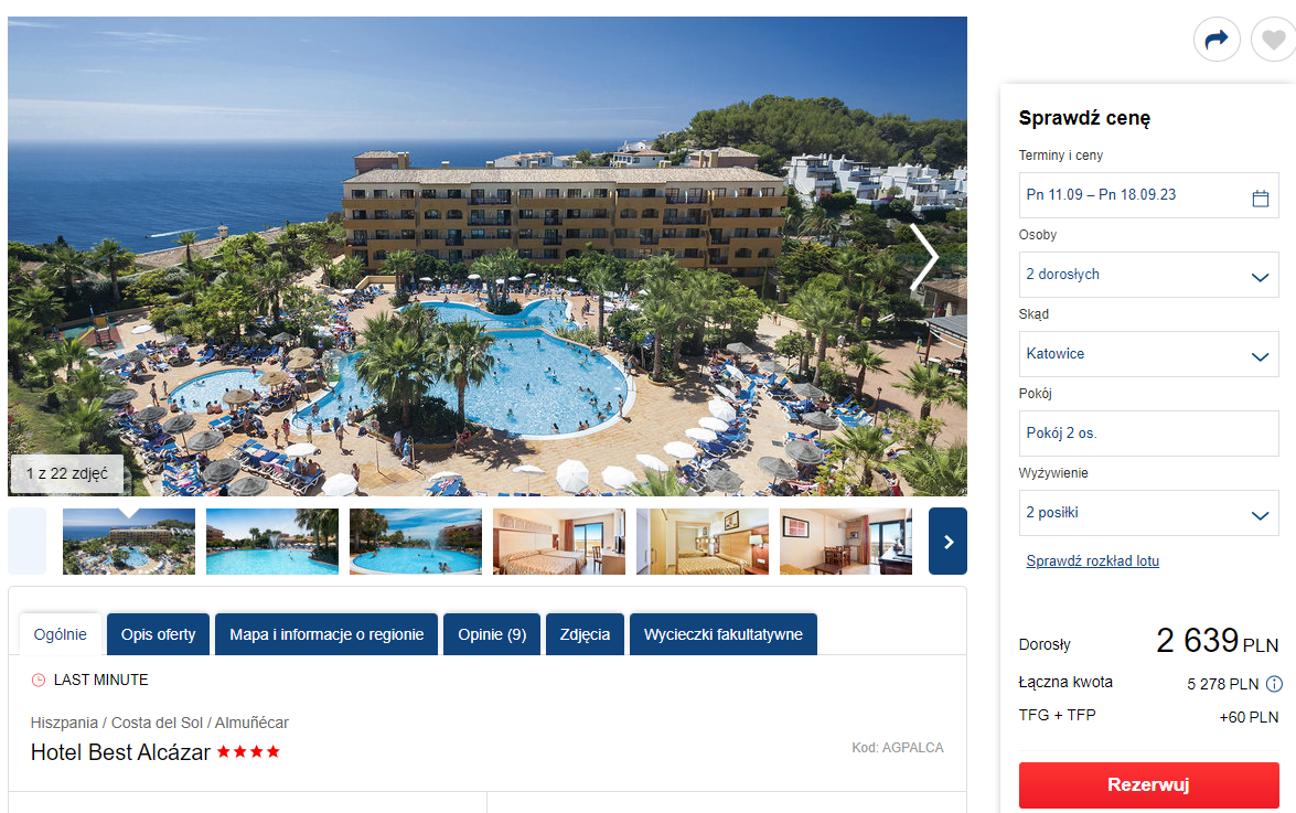 Wyjazd na hiszpańskie wybrzeże zaplanowany został w terminie 11 – 18 września. Czeka cię bezpośredni lot z Katowic lub Warszawy do Malagi, realizowany na pokładzie samolotu linii lotniczej Wizz Air. W cenę wliczono podróż z bagażem rejestrowanym (nadawanym do luku).