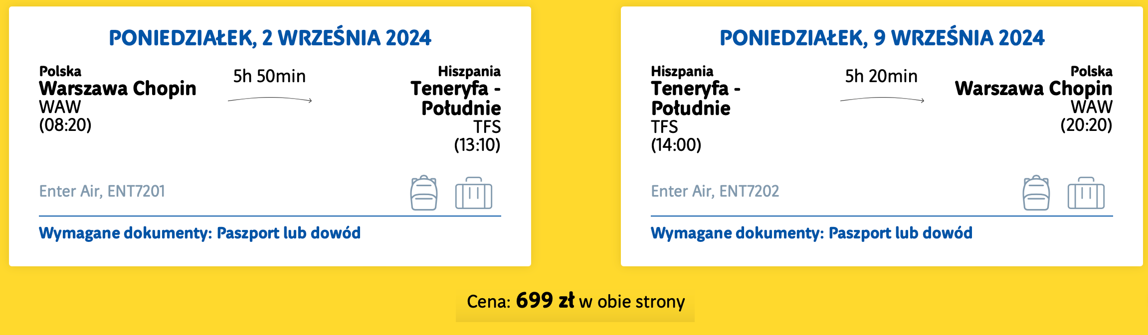Do Hiszpanii wybierzesz się jeszcze tego lata! Możesz polecieć z Warszawy na Teneryfę, Gran Canarię lub Fuerteventurę. Czeka cię podróż czarterową linią lotniczą Enter Air. Będziesz mógł zabrać ze sobą także bagaż rejestrowany.