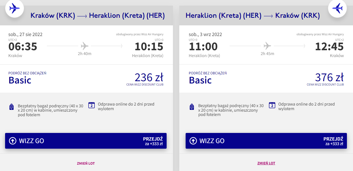 Do Heraklionu udacie się z Krakowa w terminie 27 sierpnia – 3 września. W obie strony polecicie na pokładach samolotów linii lotniczej Wizz Air z wliczonym małym bagażem podręcznym. Bilety w najniższej cenie dostępne są dla członków Wizz Discount Club, pozostałe osoby zapłacą nieco więcej.