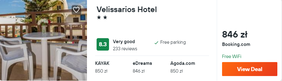 Na Krecie zakwaterowani będziecie w hotelu Velissarios. Obiekt znajduje się parę minut spacerem od plaży. Do waszej dyspozycji będą komfortowo urządzone pokoje i dostęp do WiFi.