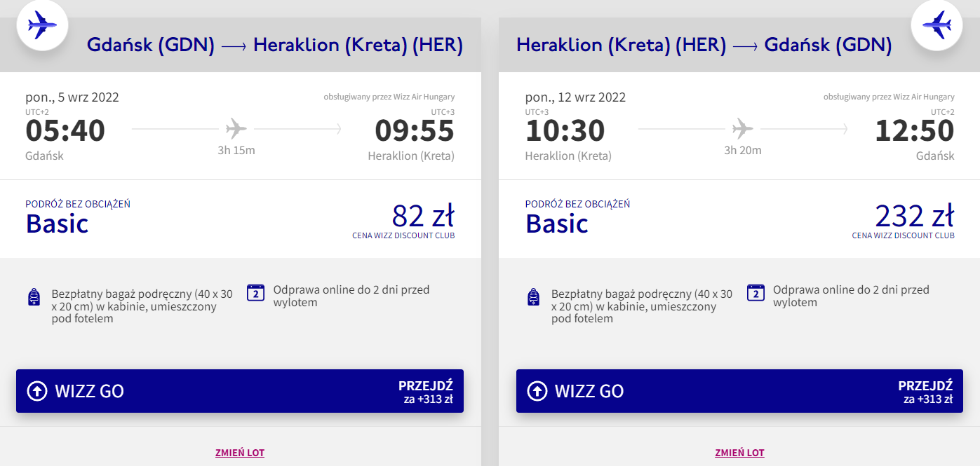 Do Heraklionu udacie się z Gdańska w terminie 5 – 12 września. W obie strony polecicie na pokładach samolotów linii lotniczej Wizz Air z wliczonym małym bagażem podręcznym. Bilety w najniższej cenie dostępne są dla członków Wizz Discount Club, pozostałe osoby zapłacą nieco więcej.