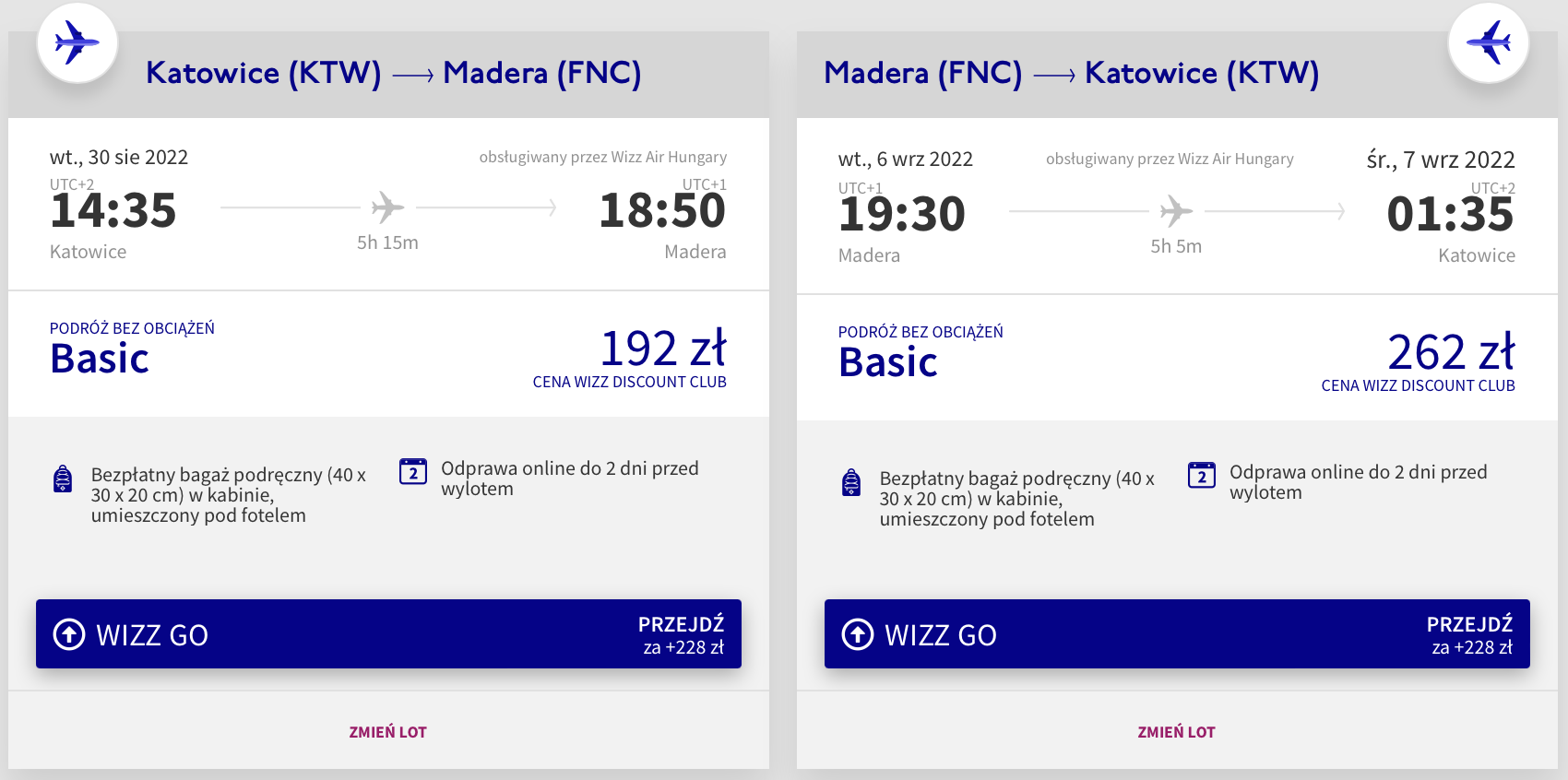 Na portugalską wyspę udacie się na przełomie sierpnia i września z portu lotniczego Katowice-Pyrzowice. W obie strony polecicie bezpośrednio na pokładach samolotów linii Wizz Air. Bilety w najniższej cenie dostępne są dla osób z Wizz Discount Club. Chętni na loty bez WDC zapłacą więcej.