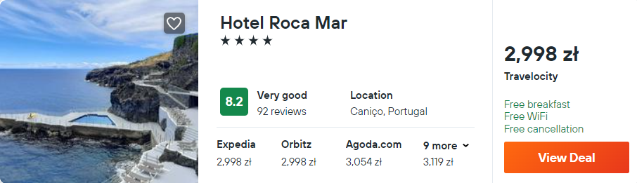 Na portugalskiej wyspie rekomenduję wam noclegi z codziennymi śniadaniami w 4* hotelu Roca Mar z odkrytym basenem. Wszystkie pokoje wyposażone zostały w klimatyzację oraz telewizor LCD. W każdym jest łazienka z wanną i prysznicem oraz balkon. Na terenie całego obiektu będziecie mogli korzystać z dostępu do sieci WiFi.