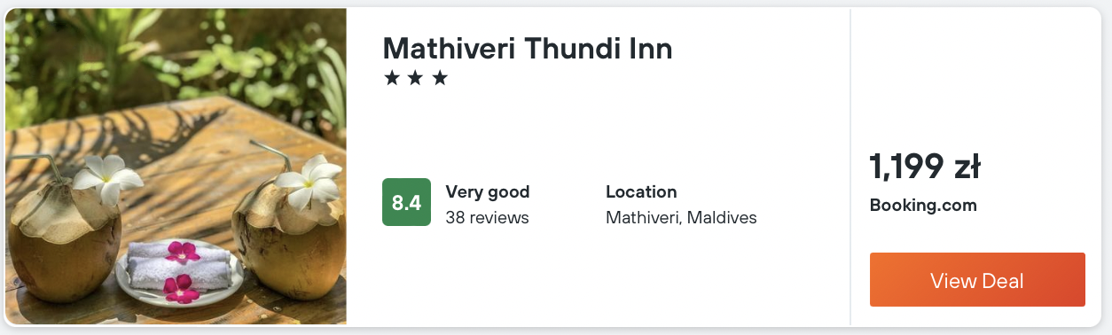 Na Malediwach zatrzymacie się w Mathiveri Thundi Inn, który położony jest na Mathiveri, jednej z ośmiu zamieszkałych wysp Alif Alif Atoll. W cenie pobytu zapewnione będziecie mieli wyżywienie: śniadania i kolacje.