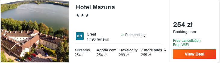 Na miejscu możecie wybierać spośród kilku ofert zakwaterowania w dobrych obiektach, ośrodkach wypoczynkowych i hotelach w: Giżycku, Mikołajkach czy Olsztynie.
