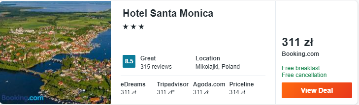 Dowiedzcie się więcej o tym hoteluFantastyczny obiekt 3* hotel Santa Monica jest położony w samym sercu malowniczego Pojezierza Mazurskiego, w centrum Mikołajek. Do dyspozycji gości są prywatne pokoje z w pełni wyposażoną prywatną łazienka z prysznicem i bezpłatnym zestawem kosmetyków. W cenę zakwaterowania zostały wliczone codzienne śniadania.