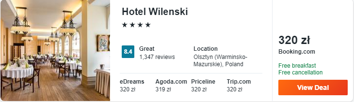 W centrum Olsztyna znajduje się klimatyczny 4* hotel Wileński. Odznacza się on zabytkowym charakterem i wystrojem w stylu art déco. Wszystkie pokoje urządzone zostały w eleganckim stylu. W każdym z nich zapewniono bezpłatne WiFi, minibar i luksusową łazienkę. W cenę zakwaterowania wliczone są codzienne śniadania.