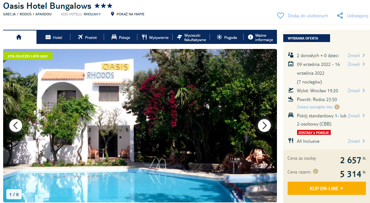 Na Rodos udacie się latem, w terminie 9 – 16 września. Na wyspę polecicie bezpośrednio z Warszawy, Wrocławia, Katowic, Gdańska lub Poznania. W cenę wliczono bagaż podręczny i rejestrowany (nadawany do luku).