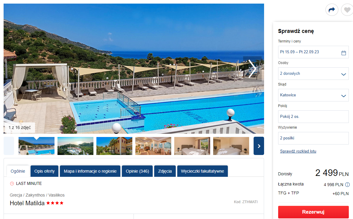 Urlop w Grecji zaplanowany został w terminie 15 – 22 września. Czeka cię bezpośredni lot na Zakintos z jednego z 4 miast w Polsce (szczegóły poniżej), realizowany na pokładzie samolotu linii lotniczej Electra Airways. W cenę wliczono bagaż rejestrowany (nadawany do luku).