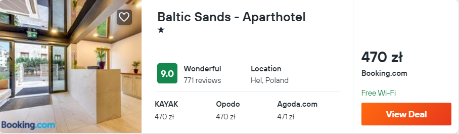 Niewiele więcej kosztować was będzie pobyt w hotelu apartamentowym – Baltic Sands, który także znajduje się w miejscowości Hel. Wszystkie pokoje zostały urządzane w nowoczesnym stylu i wyposażone w klimatyzację, telewizor LCD oraz czajnik elektryczny. W każdej łazience jest prysznic i suszarka do włosów.