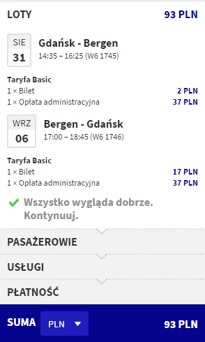 Wizz Air | Bergen 17:00 – Gdańsk 18:45 | razem 93 PLN | 6 września