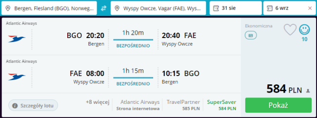 Atlantic Airways | Sorvagur 08:00 – Bergen 10:15 | razem 584 PLN | 6 września