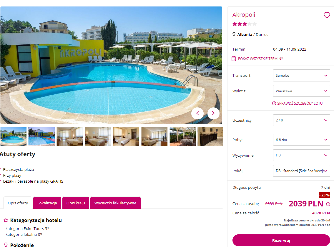 Na Bałkany wybierzesz się w terminie 4 – 11 września. Czeka cię bezpośredni lot do Tirany z lotniska w Warszawie. Bez dodatkowych opłat zabierzesz ze sobą bagaż podręczny i rejestrowany. W cenę wliczono również podstawowe ubezpieczenie.