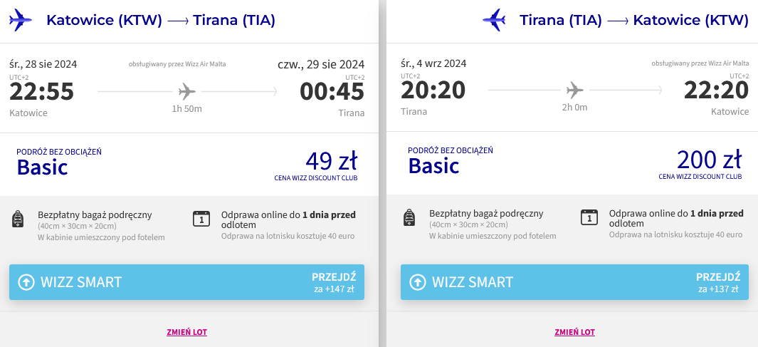 Na Bałkany wybierzesz się w terminie 28(29) sierpnia – 4 września z Katowic. Do Tirany polecisz linią Wizz Air. W cenę biletu wliczony został bagaż podręczny.