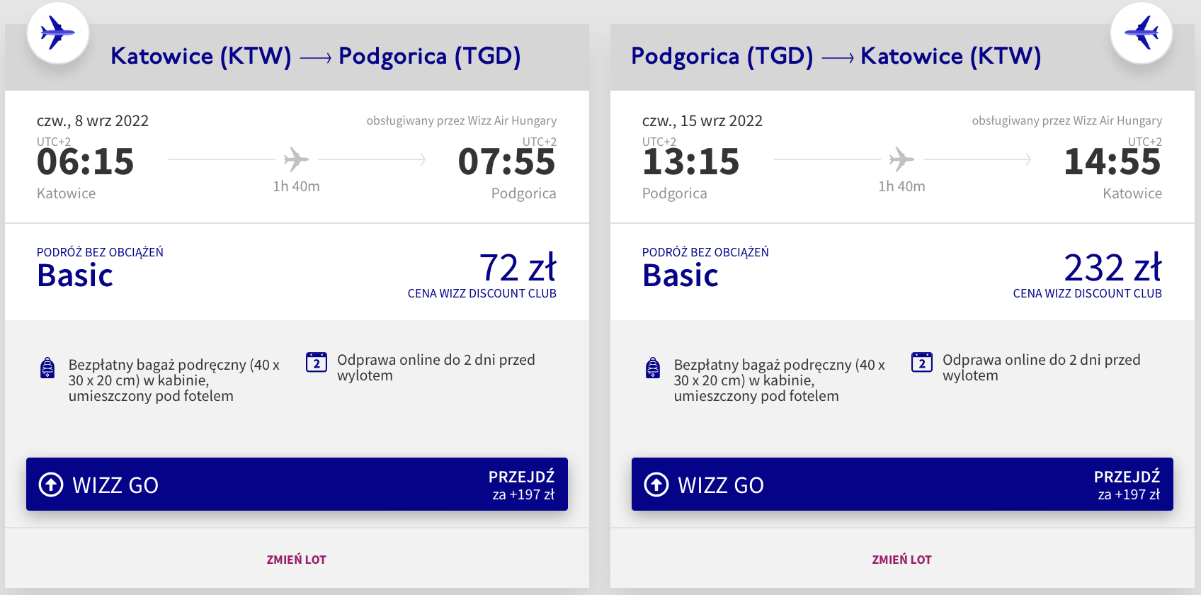Do Podgoricy udacie się w terminie 8-15 września. Wasz wyjazd rozpocznie się na lotnisku w Katowicach. Na Bałkany polecicie na pokładzie samolotu linii Wizz Air, a bez dodatkowych kosztów zabierzecie ze sobą bagaż podręczny. Bilety w najniższej cenie zakupią członkowie Wizz Discount Club, pozostałe osoby zapłacą nieco więcej.