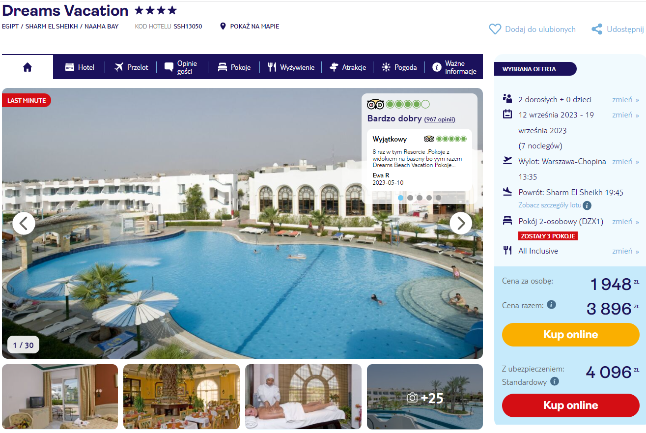 W kraju faraonów spędzisz tydzień w 4* hotelu Dreams Vacation. Plaża znajduje się 400 m od obiektu. Na terenie kompleksu znajdziesz basen zewnętrzny, taras słoneczny, strefa relaksu, siłownię i bogate zaplecze sportowe. Twój pokój wyposażony będzie w TV, balkon, klimatyzację i prywatną łazienkę.