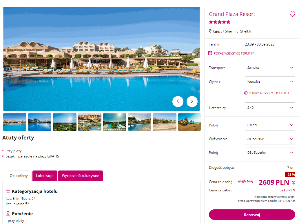 Do Egiptu wybierzesz się w dniach 23-30 września. Czeka cię bezpośredni lot do Szarm el-Szejk z Katowic. W cenę pakietu wliczono bagaż rejestrowany (nadawany do luku), transfery do hotelu, opiekę rezydenta, wyżywienie w formule all inclusive i podstawowe ubezpieczenie.