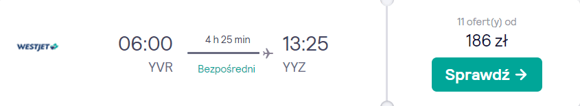 Natomiast z prowincji Kolumbia Brytyjska do prowincji Ontario polecicie bezpośrednio 21 września na pokładzie samolotu linii WestJet. Bez dodatkowych kosztów na wycieczkę udacie się z bagażem podręcznym oraz przedmiotem osobistym (mały plecak lub damska torebka).