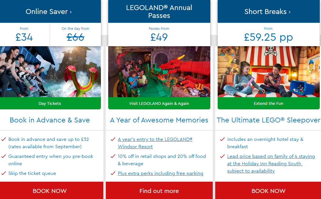 Bilety do Legolandu kupisz na oficjalnej stronie parku. Najtańsze wejściówki dostępne są za 34 GBP (ok. 176 PLN). Pamiętaj, żeby zarezerwować swoje bilety z wyprzedzeniem.
