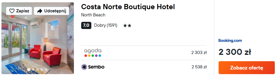 W Miami Beach zatrzymasz się w mega miejscówce, czyli 3* hotelu Costa Norte Boutique, który znajduje się blisko plaży oraz przystanku komunikacji miejskiej. Ponadto jest to spokojna okolica, knajpki pod ręką. Idealne miejsce na luz i oceaniczny reset.