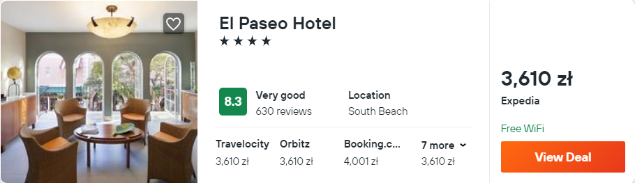 W Miami Beach zakwaterowani będziecie w 4* hotelu El Paseo, który znajduje się w odległości 100 metrów od plaży. Z lotniska w okolice miejsca noclegowego (przystanek Washington Av & Lincoln Rd) dojedziecie autobusem nr 150 lub wypożyczonym samochodem – szczegóły poniżej.
