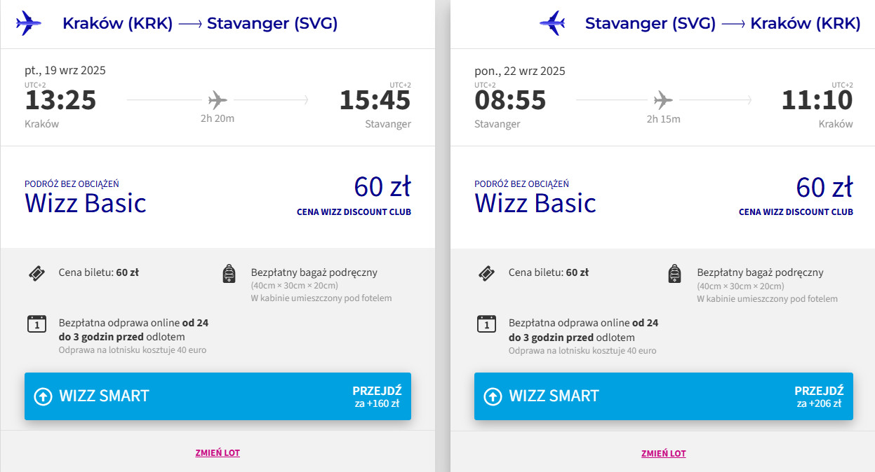 Do Stavanger udasz się w piątek (19 września) z krakowskiego lotniska w Balicach o godzinie 13:25. W drogę powrotną do Polski wyruszysz w poniedziałek (22 września), a wylot zaplanowano na godzinę 8:55. W obie strony podróżować będziesz linią Wizz Air z bagażem podręcznym. Bilety w najniższej cenie dostępne są dla członków Wizz Discount Club. Chętni na loty bez WDC zapłacą więcej.