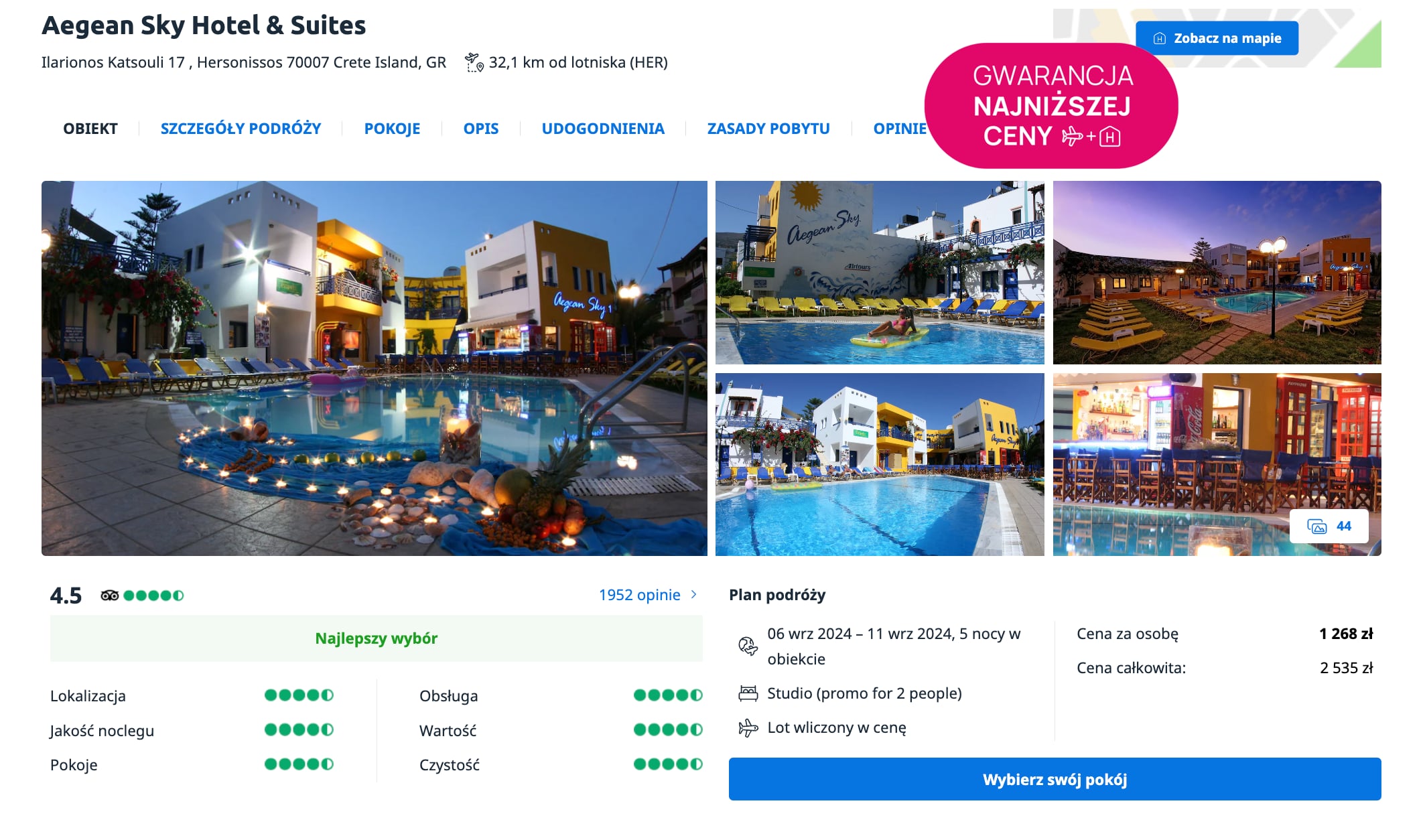 Na Krecie spędzisz tydzień w bardzo dobrze ocenianym Aegean Sky Hotel & Suites. Do twojej dyspozycji będzie basen zewnętrzny z tarasem słonecznym, darmowe WiFi oraz przestronne studio z klimatyzacją, aneksem kuchennym, balkonem lub tarasem i prywatną łazienką.