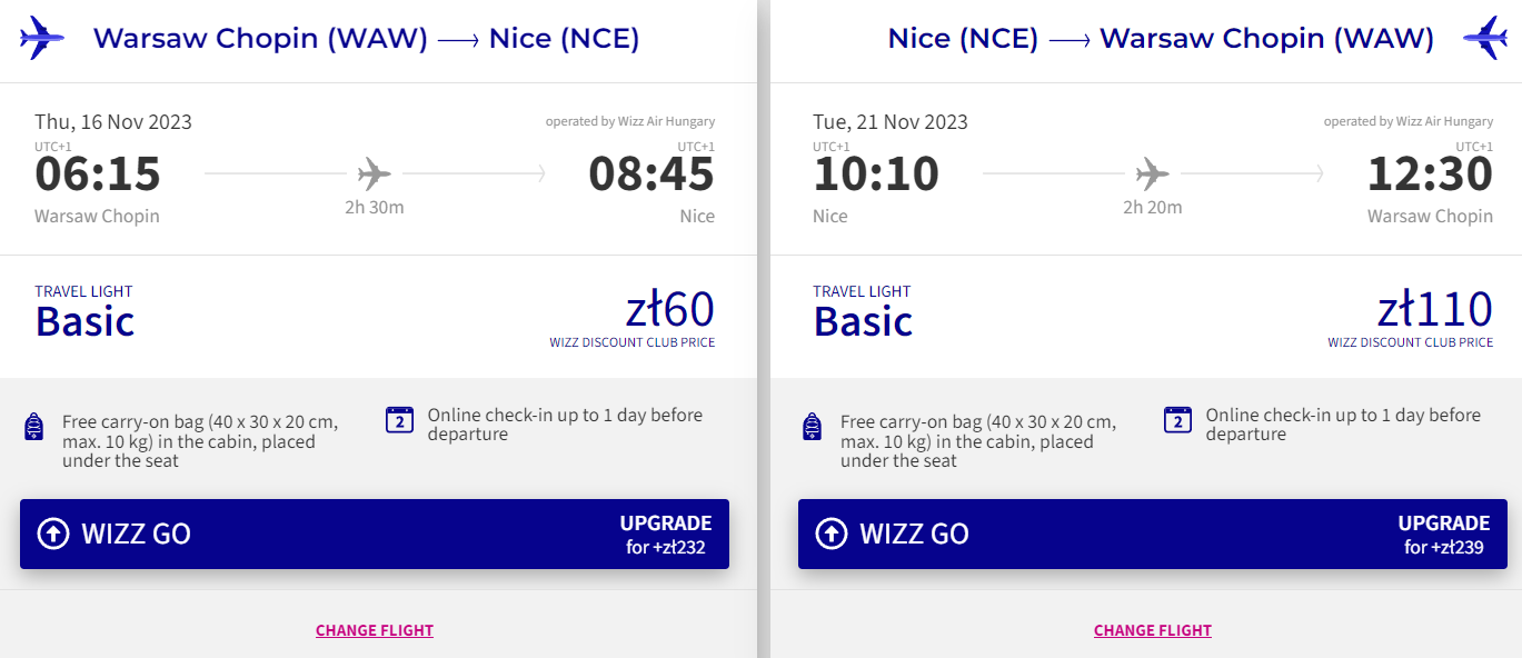Do Nicei wybierzesz się w terminie 16-21 listopada (czwartek-wtorek) z lotniska w Warszawie. W obie strony polecisz na pokładach samolotów linii lotniczej Wizz Air z wliczonym małym bagażem podręcznym. Bilety w najniższej cenie dostępne są dla osób z Wizz Discount Club. Chętni na loty bez WDC zapłacą nieco więcej.