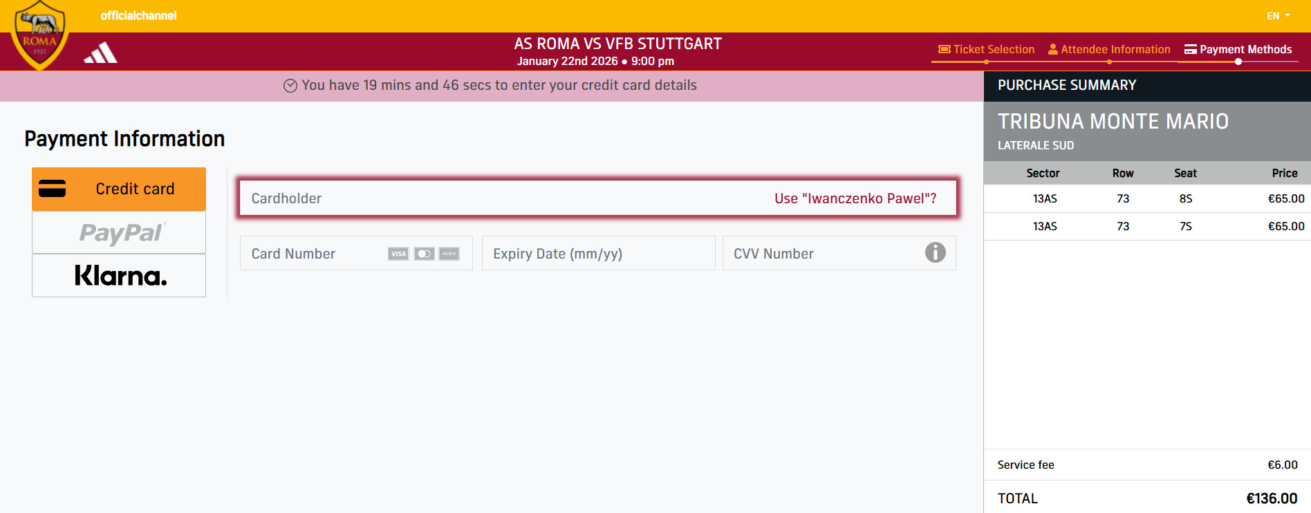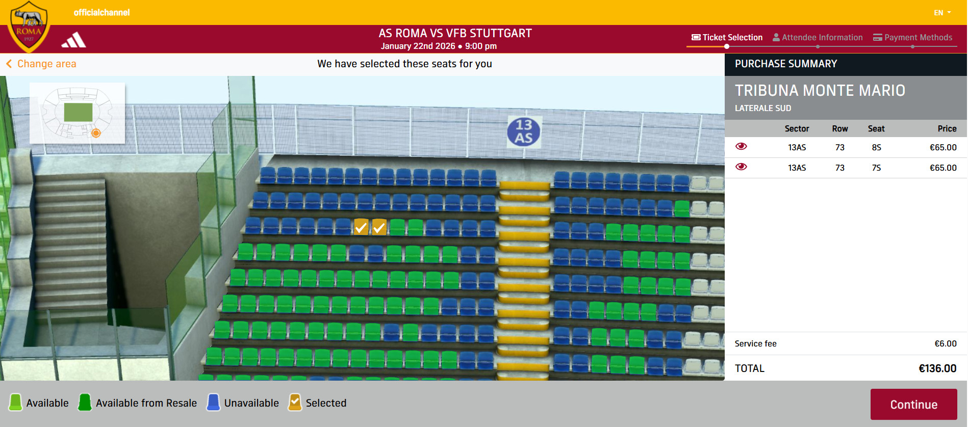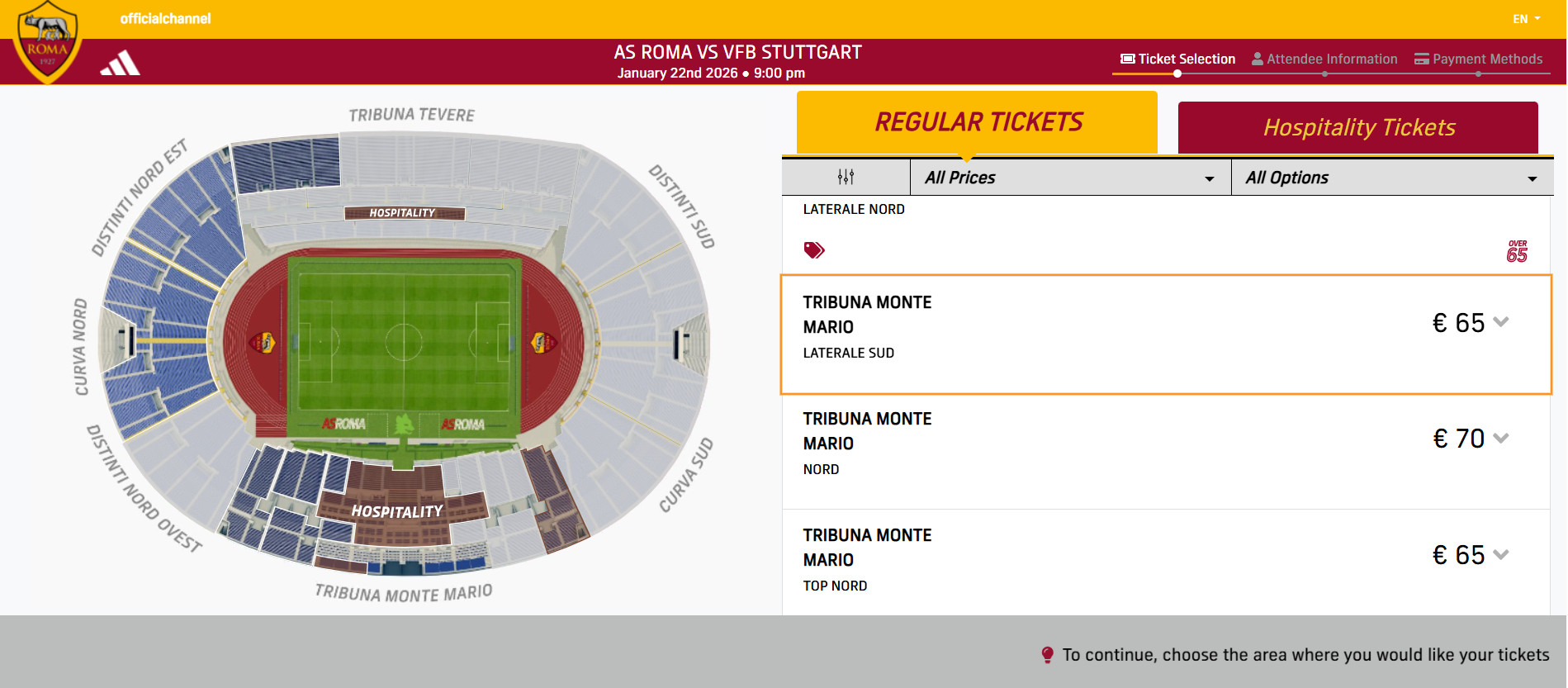Bilety w otwartej sprzedaży dostępne są na oficjalnej platformie klubu z Wiecznego Miasta. Do zakupu potrzebne jest konto w serwisie asroma.com, które założysz całkowicie bezpłatnie. Wejściówki w wolnej sprzedaży na mecz Ligi Europy pomiędzy AS Romą a VfB Stuttgart (22 stycznia, 21:00) dostępne są od 68 EUR/osoba (bilet i opłata administracyjna).