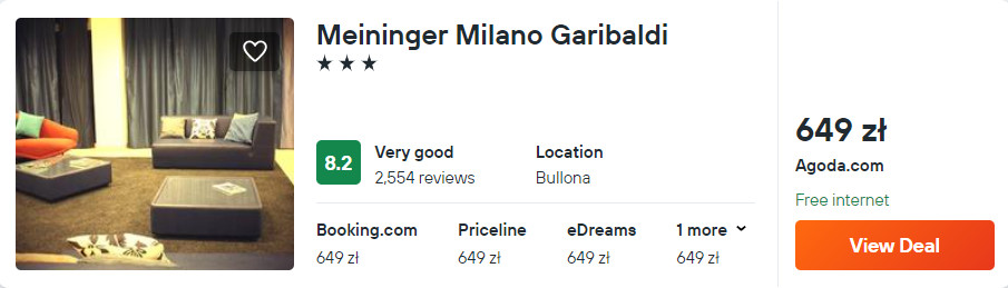 Jesteś w stanie wydać nieco więcej na nocleg? W takim razie rozważ pobyt w 3* Meininger Milano Garibaldi, który od stacji metra Milano Porta Garibaldi oddalony jest o 5 minut spokojnego spaceru. W każdym pokoju jest łazienka z prysznicem.