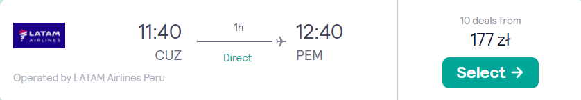 W trakcie twojego pobytu w Peru wybierzesz się do Cuzco (26 marca). Stamtąd łatwo możesz udać się na Machu Picchu. Następnie 29 marca czeka cię lot do Puerto Maldonado, które będzie idealną bazą wypadową do zwiedzania dżungli. Do stolicy Peru wrócisz 3 kwietnia. Skorzystasz z usług przewoźnika LATAM Airlines.