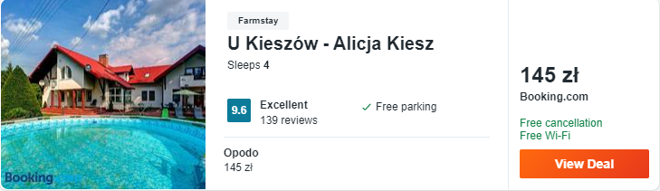 Dowiedzcie się więcej o tym hoteluObiekt U Kieszów – Alicja Kiesz usytuowany jest w Ustrzykach Dolnych. Miejsce to może pochwalić się bardzo dobrymi opiniami dotychczasowych gości. Możecie bezpłatnie odwołać rezerwację do tygodnia przed przyjazdem.