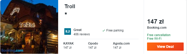 Dowiedzcie się więcej o tym hoteluPensjonat Troll położony jest w miejscowości Cisna. Na miejscu znajdziecie przytulne pokoje, wykończone drewnem. Goście mogą zrelaksować się na tarasie lub wypożyczyć rower.