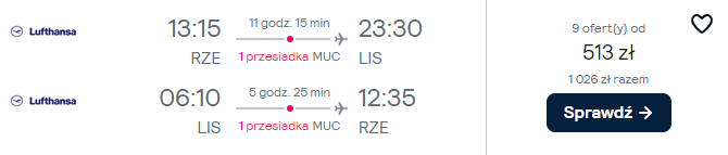 Do Portugalii udasz się w terminie 15 – 19 listopada (piątek – wtorek) z Lufthansą. Jako miejsce wylotu do wyboru masz Rzeszów, Wrocław, Warszawę, Kraków, Gdańsk lub Poznań. Po drodze przesiądziesz się w Monachium oraz Frankfurcie.