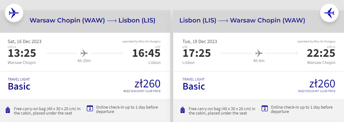 Podróż do Portugalii odbędzie się w dogodnym terminie obejmującym weekend (sobota – wtorek) 16 – 19 grudnia. Czeka cię bezpośredni lot z Warszawy do Lizbony, realizowany na pokładzie samolotu linii lotniczej Wizz Air. Bilety w najniższej cenie zarezerwują członkowie Wizz Discount Club, pozostałe osoby zapłacą nieco więcej. Dowiedz się więcej, jakie korzyści płyną z przystąpienia do programu lojalnościowego węgierskiego przewoźnika.