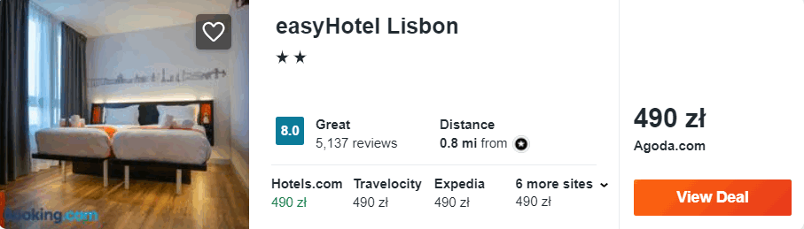 Na miejscu proponuję wam noclegi w bardzo dobrym 2* easyHotel Lizbona. Wszystkie pokoje wyposażone są w klimatyzację, ogrzewanie, telewizor LCD. W łazience jest prysznic, suszarka do włosów oraz bezpłatny zestaw kosmetyków. Na terenie całego obiektu zapewniony będziecie mieli dostęp do sieci WiFi.