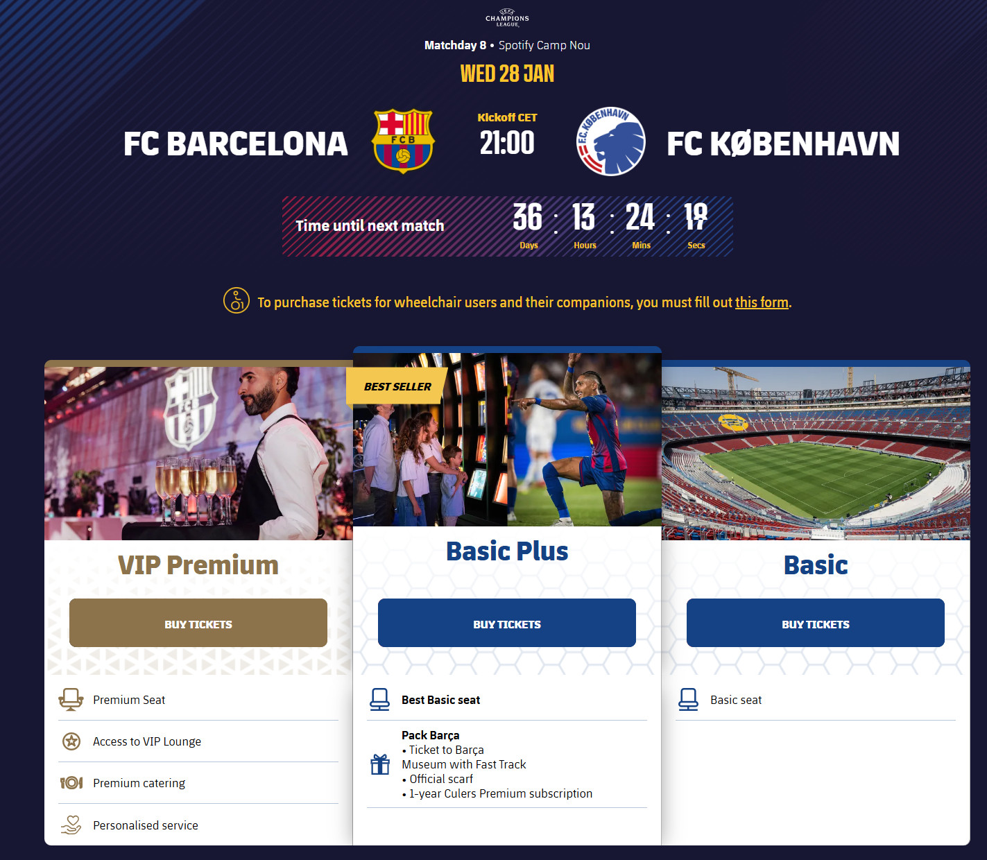 W cenę pakietu wliczyłem także bilety na mecz Ligi Mistrzów (28 stycznia, godzina 21:00) pomiędzy drużynami FC Barceloną a FC Kopenhagą.