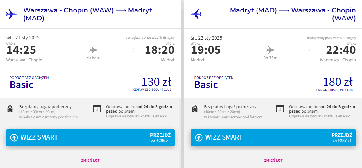 Do Madrytu udasz się z Krakowa (linią Ryanair) lub Warszawy (linią Wizz Air) w terminie 21-22 stycznia przyszłego roku. W obie strony polecisz bezpośrednio. Pamięta, że bilety w irlandzkiej linii dostępne są dla wszystkich chętnych. Natomiast loty w najniższej cenie w Wizz Air dostępne są dla członków Wizz Discount Club. Chętni na loty bez WDC zapłacą więcej.